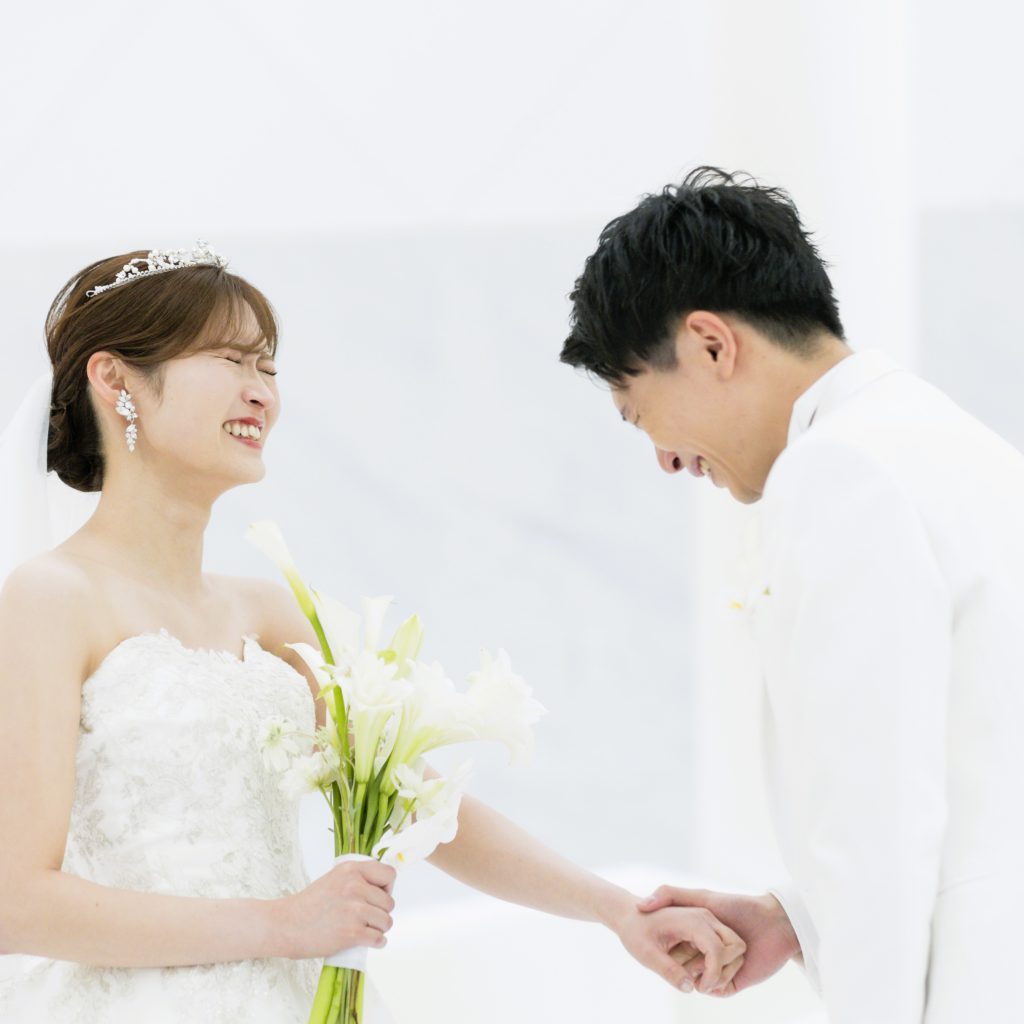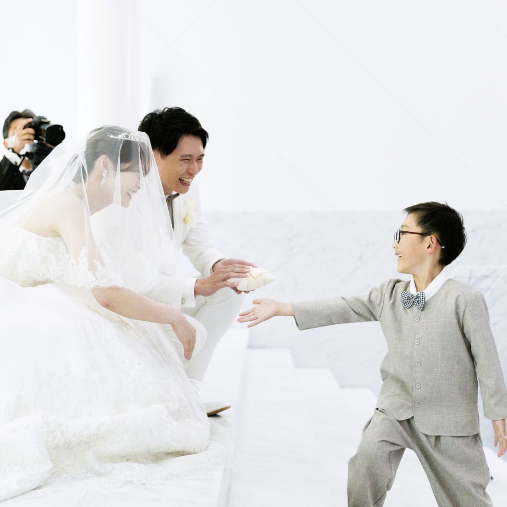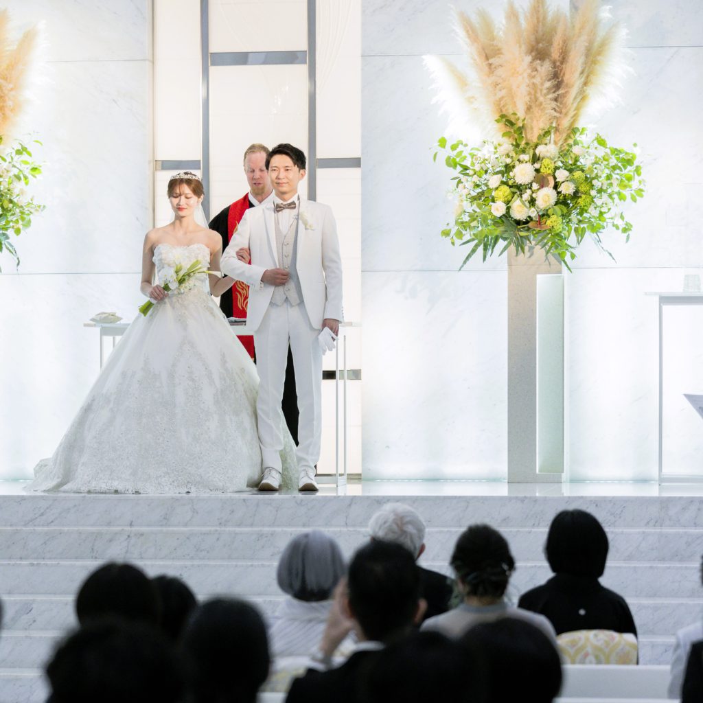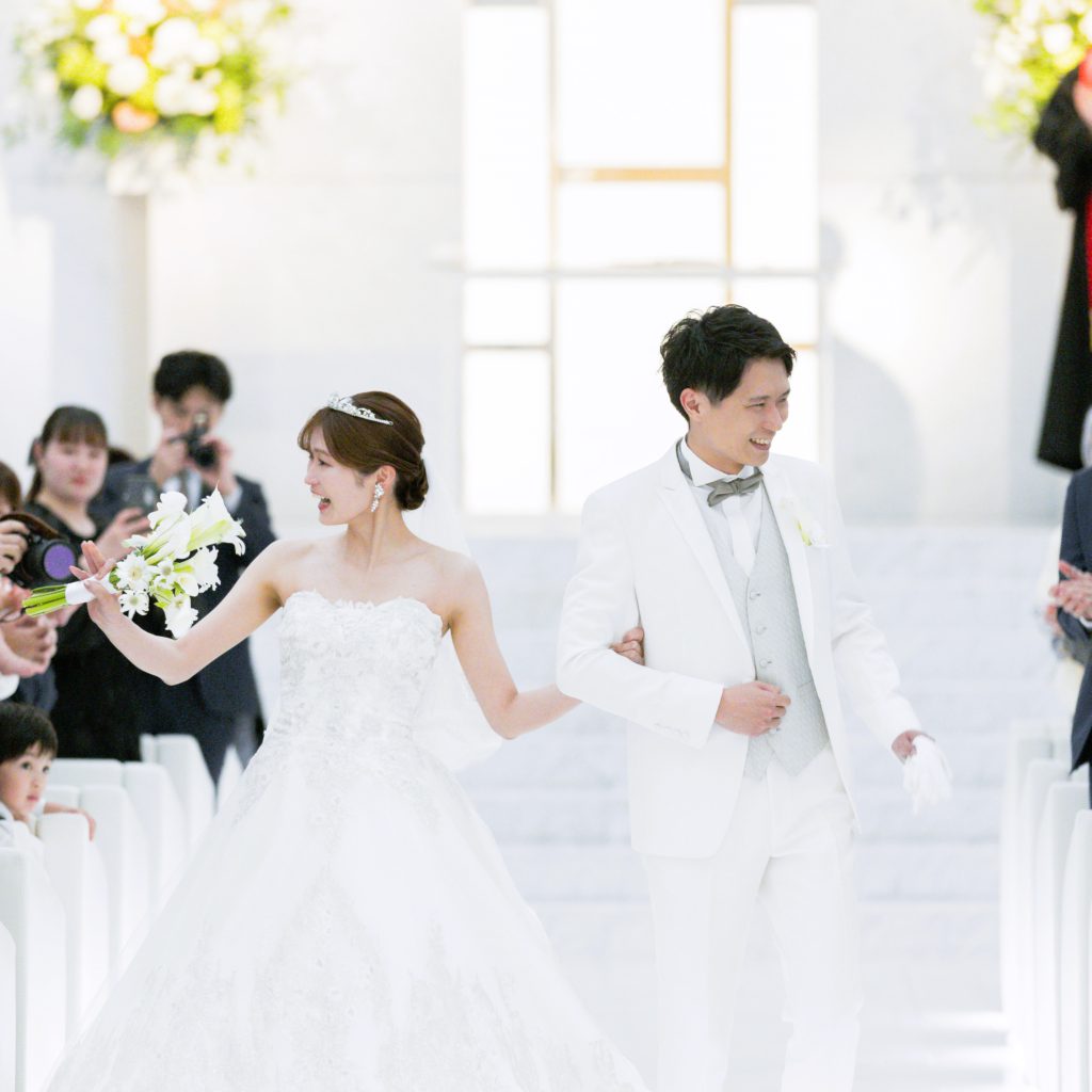人前式と悩みましが、Wさんの真っ白なチャペルで挙げるならキリスト教式がいい!と思いキリスト教式にしました。始めは緊張しましたが、牧師さんもとても気さくで楽しむことができました。また、バックの長いドレスを選んだ為、バージンロードを歩く姿や自分たちの後ろ姿を写真で綺麗に残していただけて大満足でした。