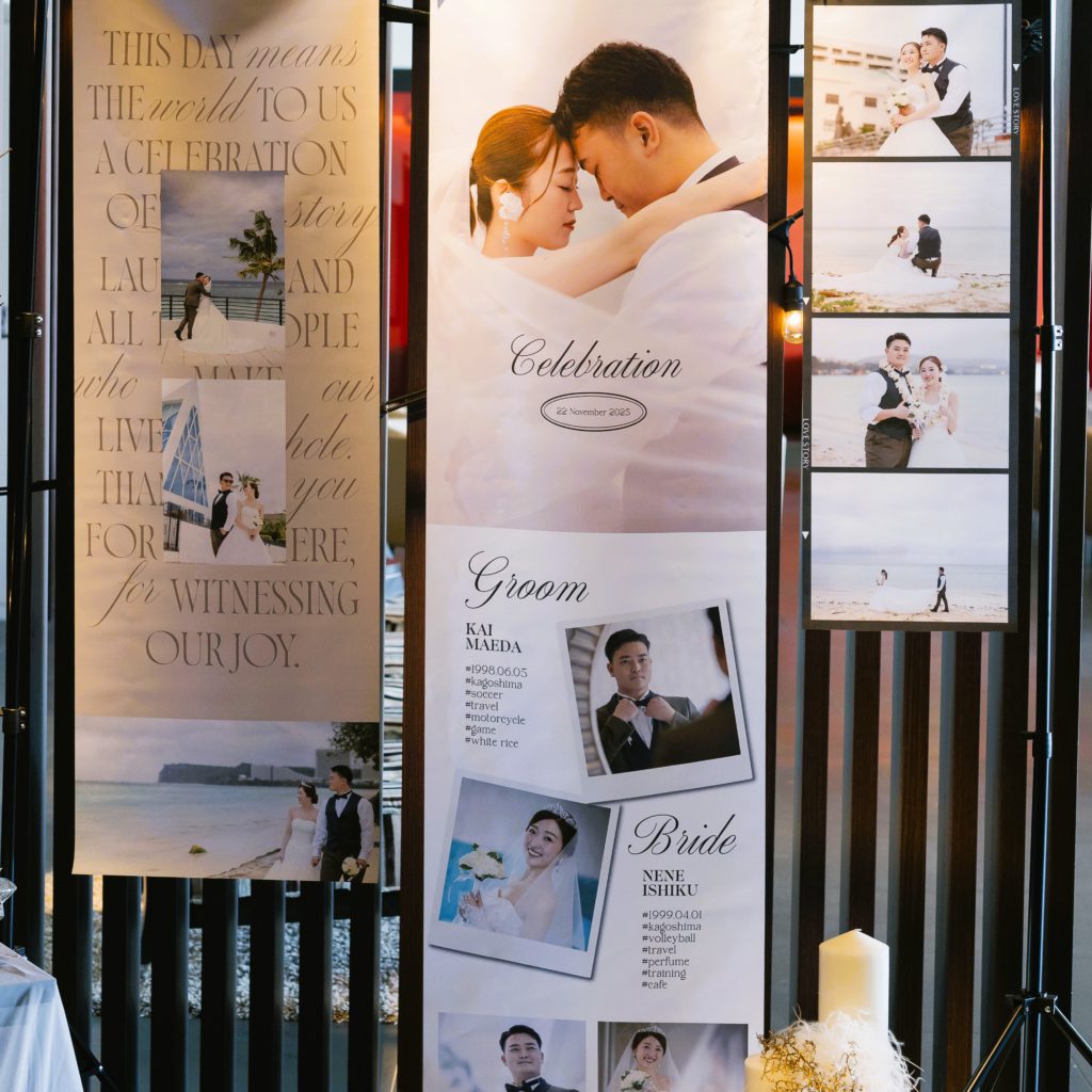 ・私たちらしい結婚披露宴にしたいと思い、プロフィールブック・プロフィールムービー・オープニングムービーを自分たちで作成しました。ウェルカムスペースもこだわり、ゲストの皆様から好評でした。